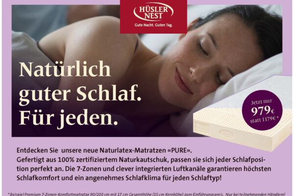 Entdecken Sie unsere neue Naturlatex-Matratzen «PURE». Gefertigt aus 100% zertifiziertem Naturkautschuk, passen sie sich jeder Schlafposition perfekt an. Die 7-Zonen und clever integrierten Luftkanäle garantieren höchsten Schlafkomfort und ein angenehmes Schlafklima für jeden Schlaftyp! Jetzt zum Einführungspreis! * Beispiel Premium 7-Zonen-Komfortmatratze 90/200 cm mit 17 cm Gesamthöhe (15 cm Kernhöhe) zum Einführungspreis. Nur bei teilnehmenden Händlern!